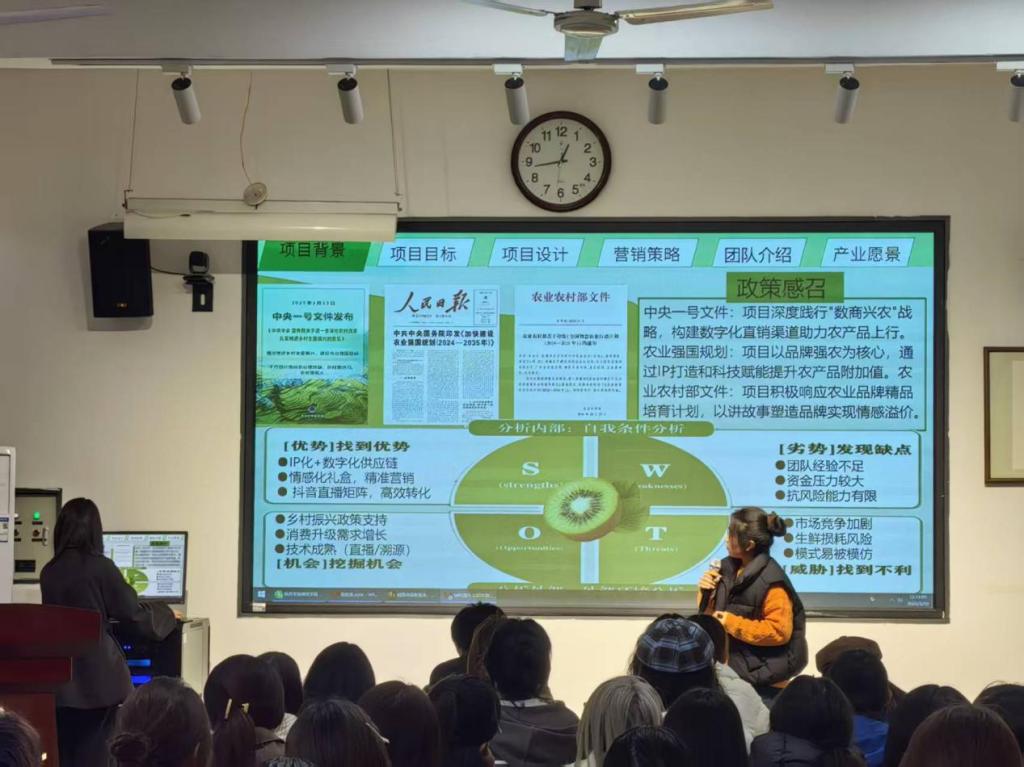 活动伊始,学生项目分享环节有序开展,两组学生代表依次登台,展示项目构想。第一组围绕“柒味猕园”品牌建设展开分享,提出以线上线下融合模式拓宽眉县猕猴桃销售渠道,兼具实用性与社会价值;第二组聚焦幼儿健康领域,创新性提出运用智能背心陪伴机器人,对儿童注意力缺陷多动障碍进行科学干预的项目设想,贴合幼儿教育专业特色。两组分享结束后,王继康老师针对项目内容进行了专业的点评,为项目负责人优化后续内容、完善方案指明了方向。