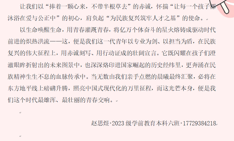翰墨飘香歌盛世,青春筑梦启新程。此次征文活动,不仅为学子搭建了展现才情、抒发胸臆的平台,更让“青春担使命”的信念扎根心底,让“文脉润童心”的理念融入专业实践。愿我院学前学子皆能以此次活动为契机,怀赤子之心,执育人之笔,在深耕幼教事业的道路上,书写属于新时代的青春华章!
