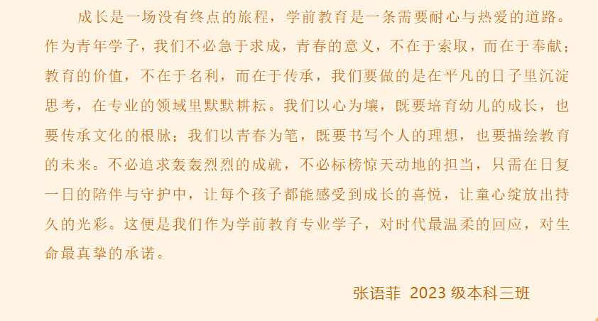 本次活动自启幕以来,便点燃了全院学前教育专业学子的创作热忱。同学们怀揣着对幼教事业的赤诚之心,紧扣两大核心主题挥洒笔墨。或以青春之思擘画育人蓝图,将个人理想融入国家学前教育发展的宏伟征程,畅谈以专业学识赋能幼儿成长的使命担当;或以传承之志探寻文化根脉,深挖中华优秀传统文化与幼儿教育的融合路径,勾勒出用故事、儿歌、艺术活动为童心播撒文化种子的生动图景。一篇篇佳作字字珠玑,既饱含着新时代青年对使命的深刻体悟,更彰显着学前人守护文化根脉的坚定决心。